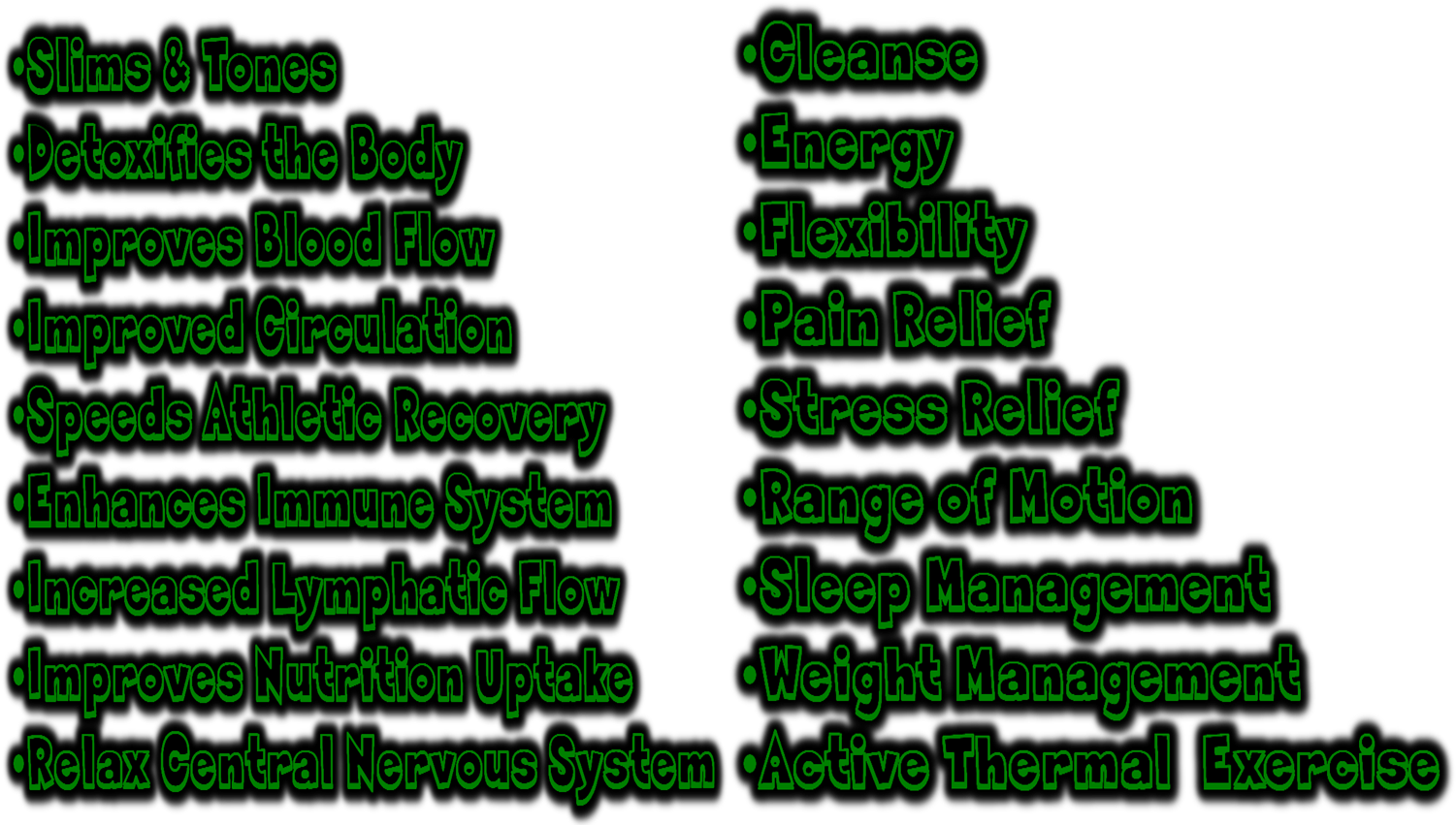 Heating the body activates sweat glands as the body seeks to cool itself. It promotes a profound sweating response, the natural removal of impurities and a healthy cardiovascular response. Promotes physical fitness, assists with weight loss goals and maintain a healthy weight.