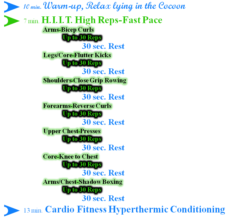 Low impact exercise routines performed in a controllable heat environment while lying in the supine position on a vibratory bed in the Cocoon 4 Life Wellness POD.